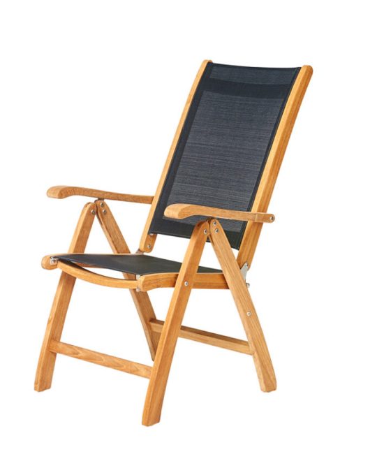 Teakhouten deckchair met voetenbankje en zwarte textilene bespanning. Traditional Teak, model Kate. Leverbaar in diverse kleuren textilene bespanning.