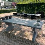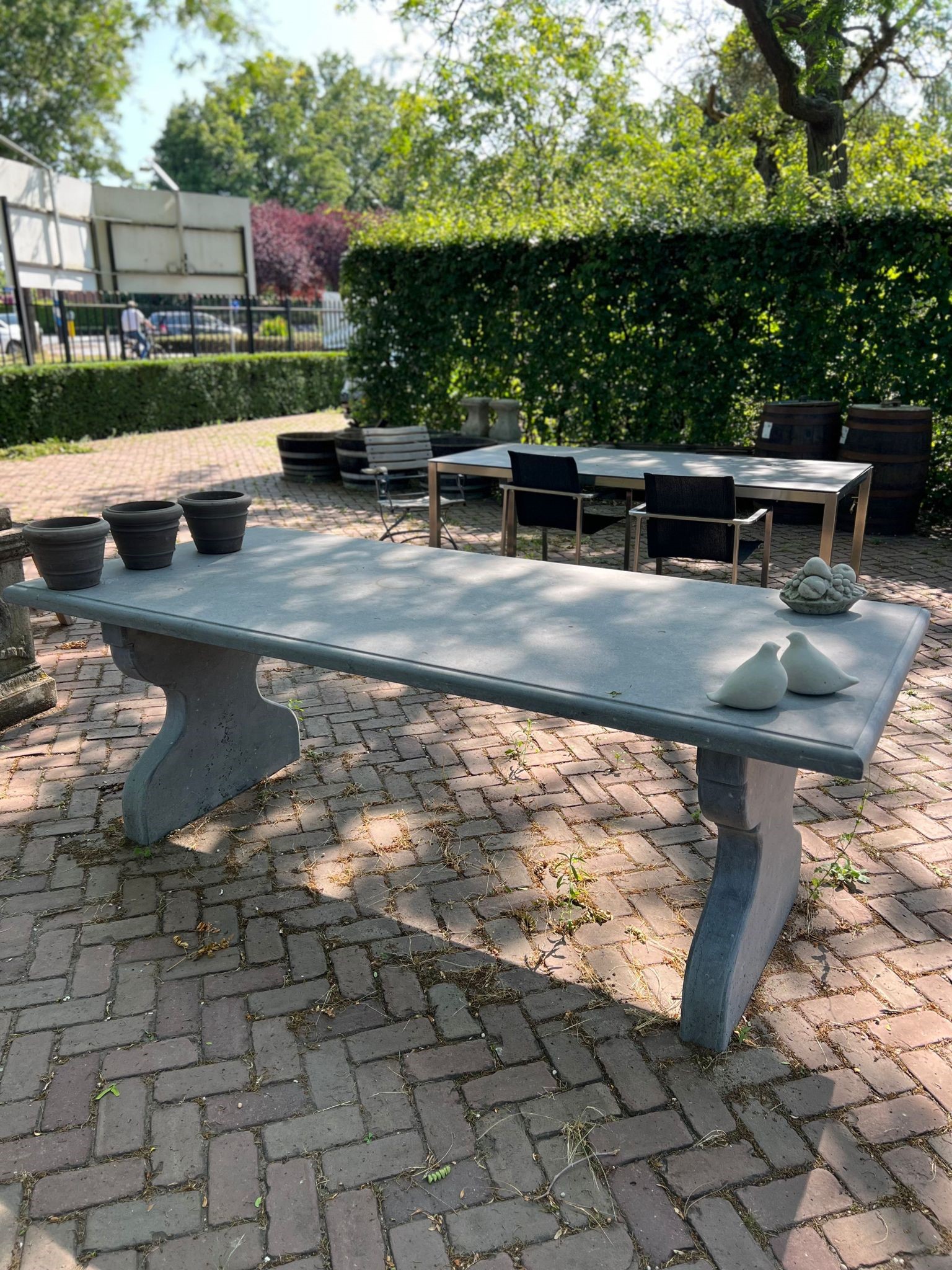 Door inruil verkregen Belgisch hardstenen tuintafel met papagaaienbek. Afmeting 220x100x79x5 cm.