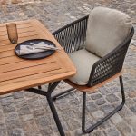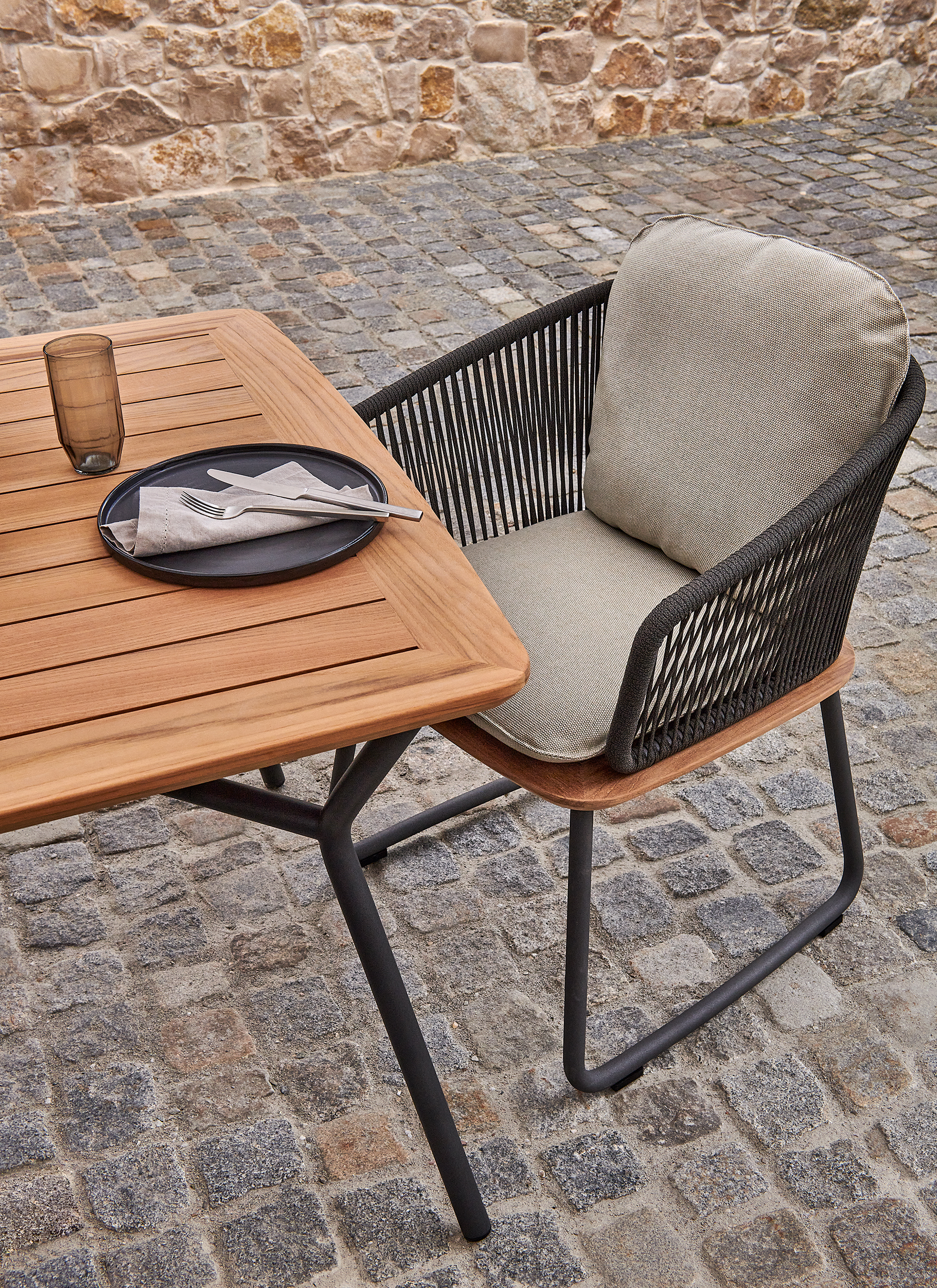 Teakhouten stapelbare armstoel van het merk Traditional Teak, model Carlos. Afmetingen: 54x57x84 (lxdxh).