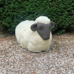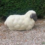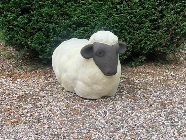 Groot liggend winterhard handgemaakt stenen schaap. In de kleurstelling mergel met zwart kopje.