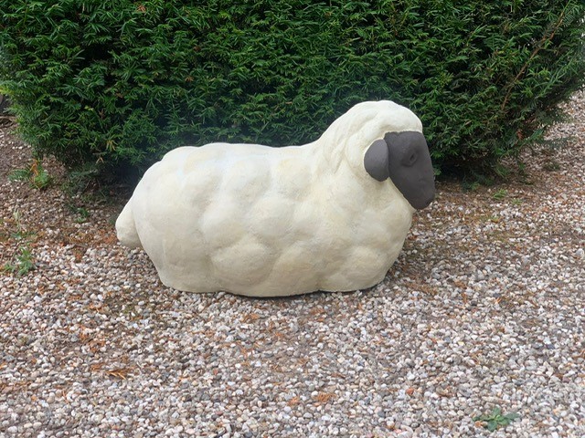 Winterhard , handgemaakt stenen schaapje in de kleurstelling mergel met zwart kopje. 51x27x29 cm ( lxbxh ).